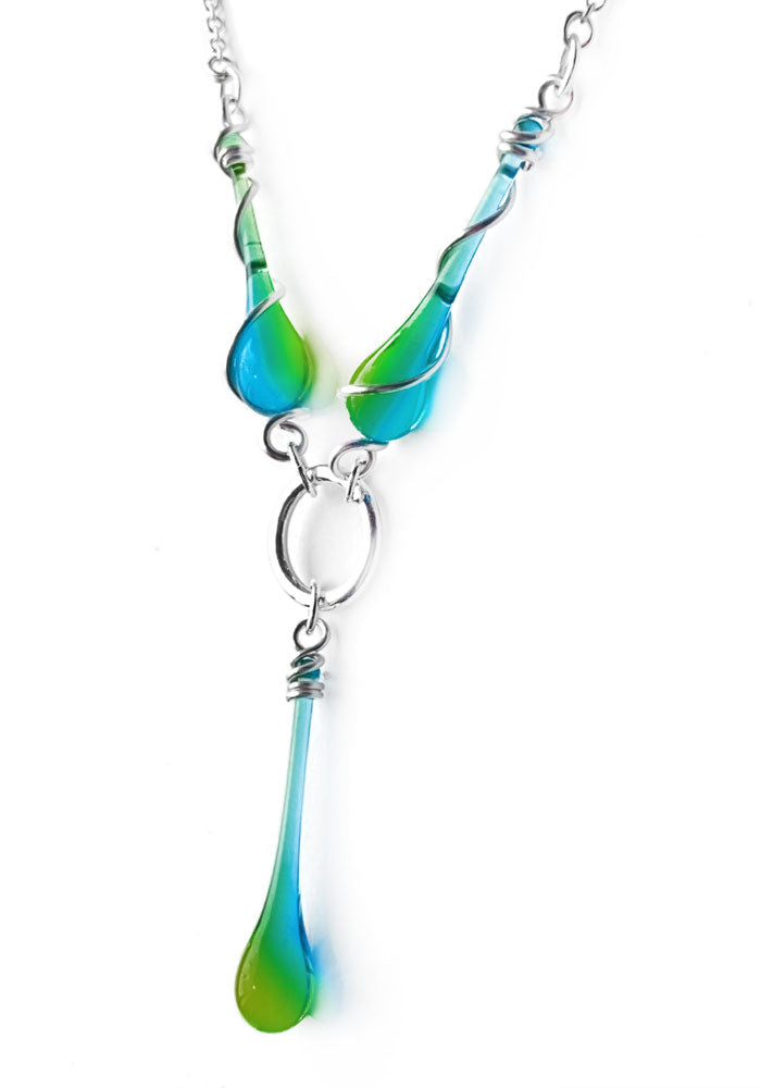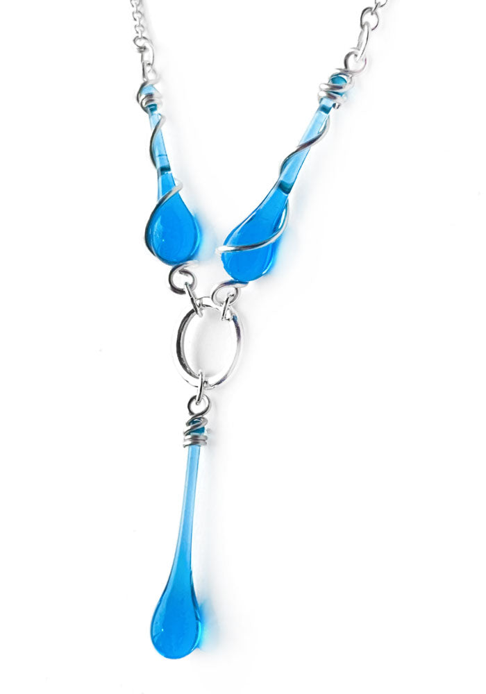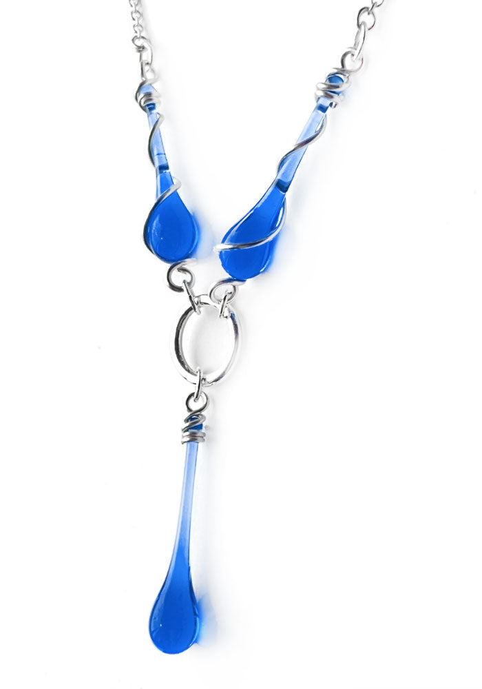 You are unique and original, and your jewelry should be too! Each drop of glass is handmade in the artist’s backyard studio in Berkeley, California. Using a giant magnifying glass to focus sunshine, recycled bottles and stained glass were melted into these translucent, flowing drops under the open sky! No pieces are exactly alike.