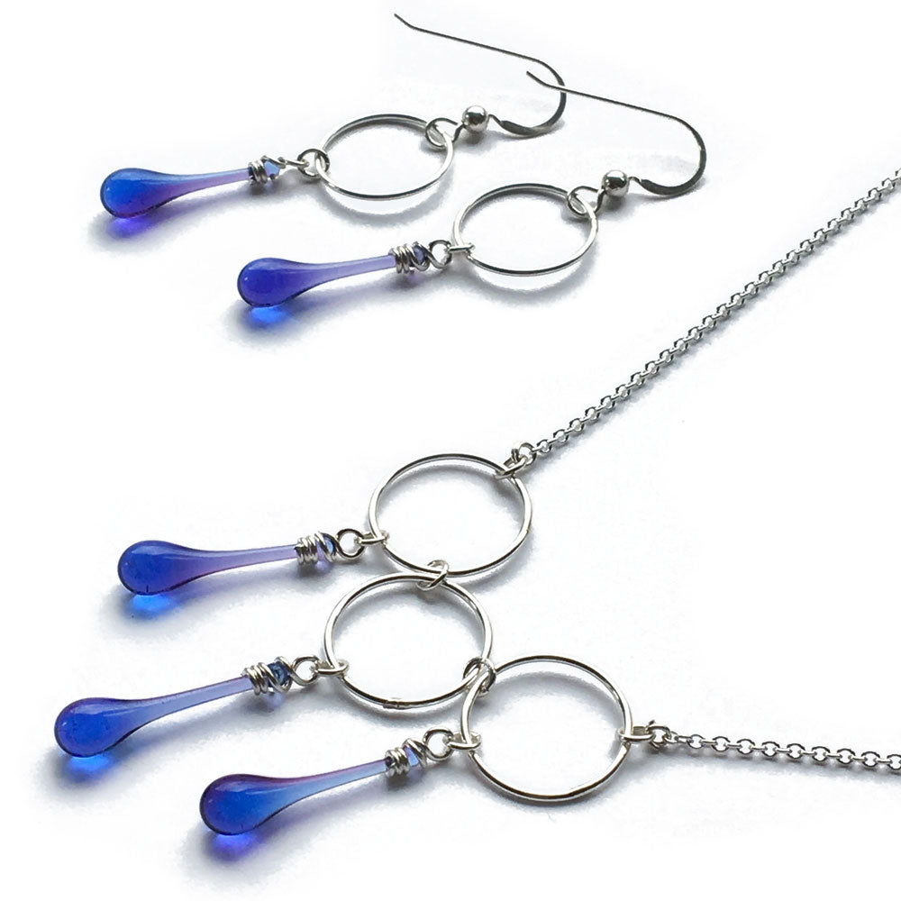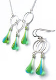 We use stained art glass or recycled bottle glass to make the droplets themselves. All wire and ear hooks are hypo-allergenic sterling silver, and the sterling silver wire is 100% recycled. Necklaces come on sterling silver chain.