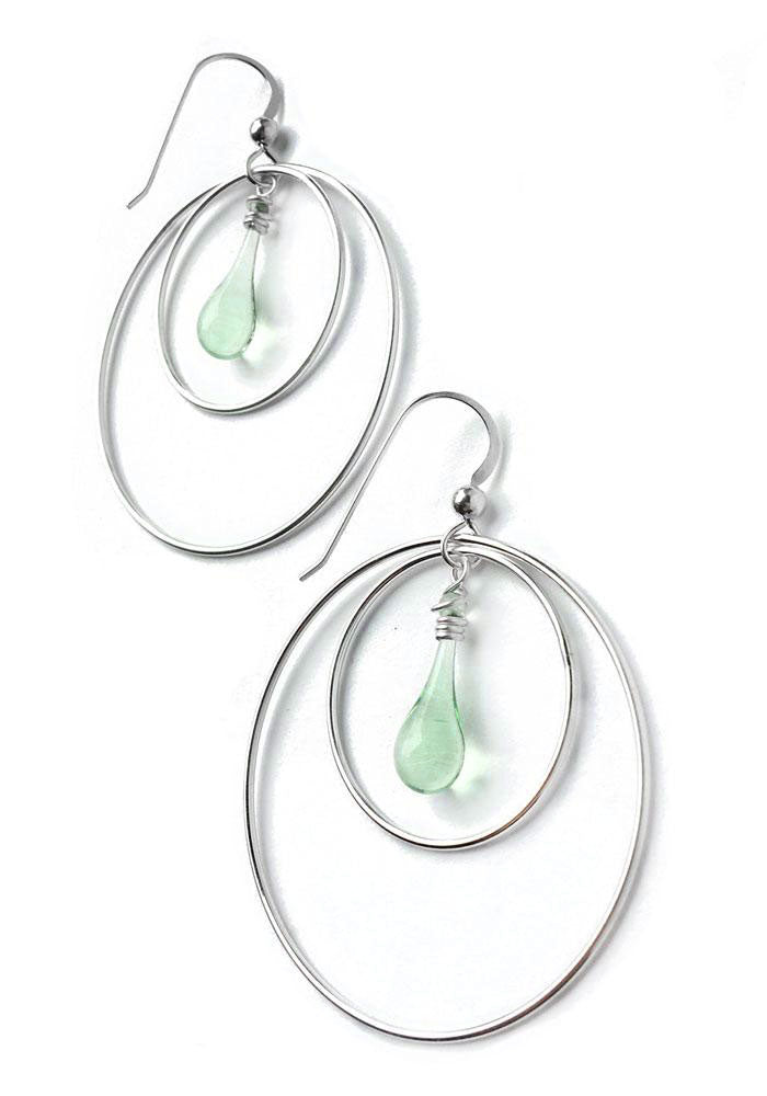We use stained art glass or recycled bottle glass to make the droplets themselves. All wire and ear hooks are hypo-allergenic sterling silver, and the sterling silver wire is 100% recycled. Necklaces come on sterling silver chain.