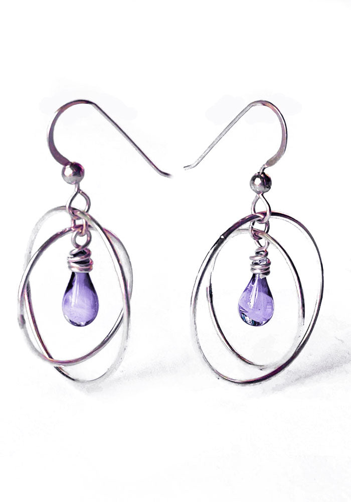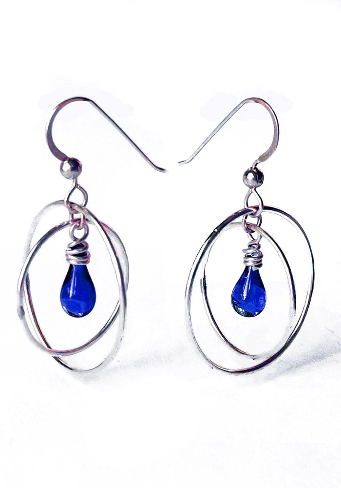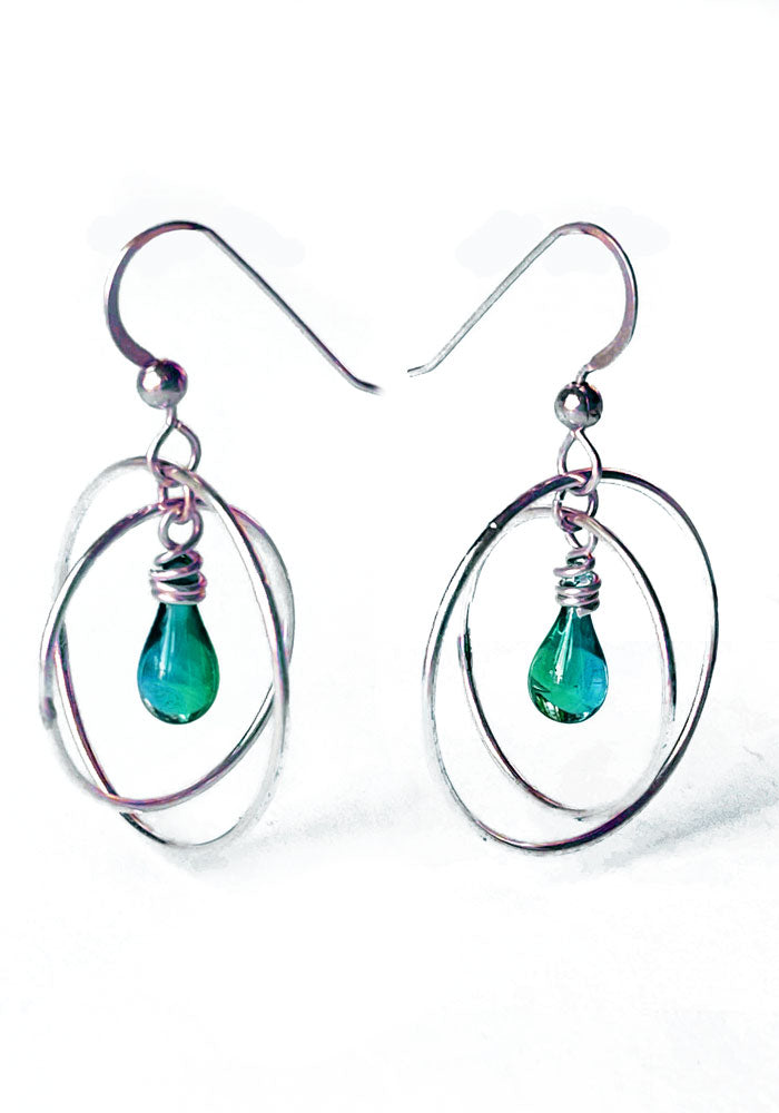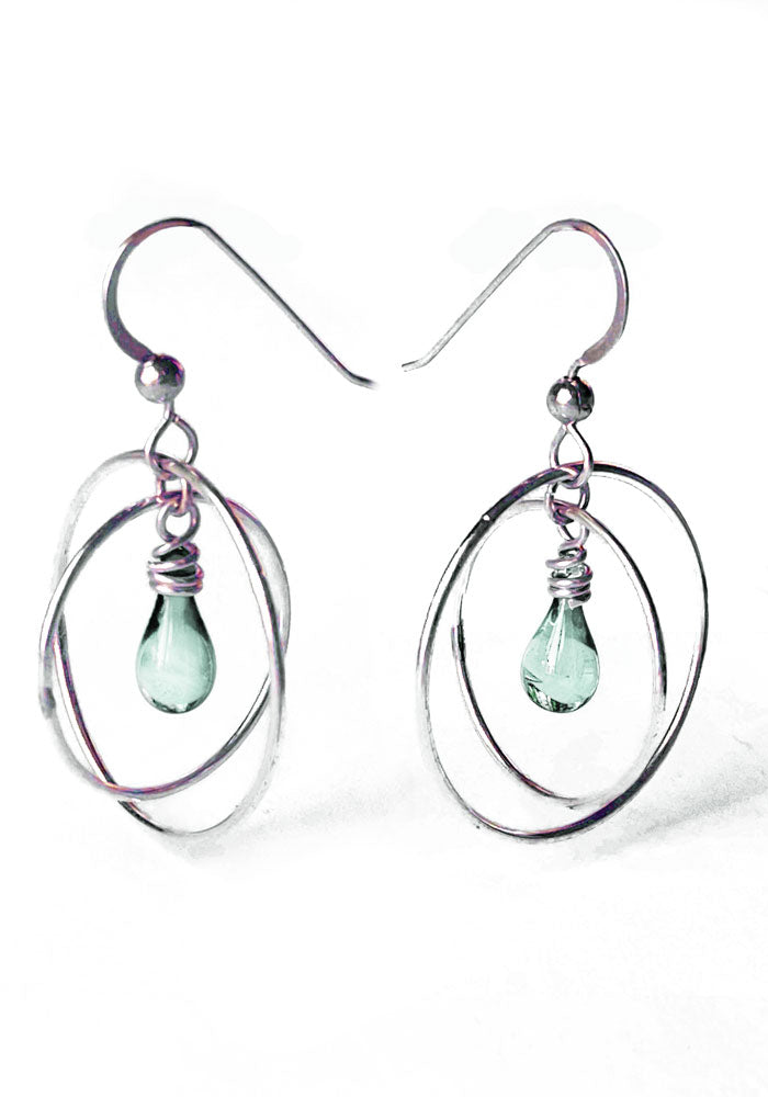 We use stained art glass or recycled bottle glass to make the droplets themselves. All wire and ear hooks are hypo-allergenic sterling silver, and the sterling silver wire is 100% recycled. Necklaces come on sterling silver chain.