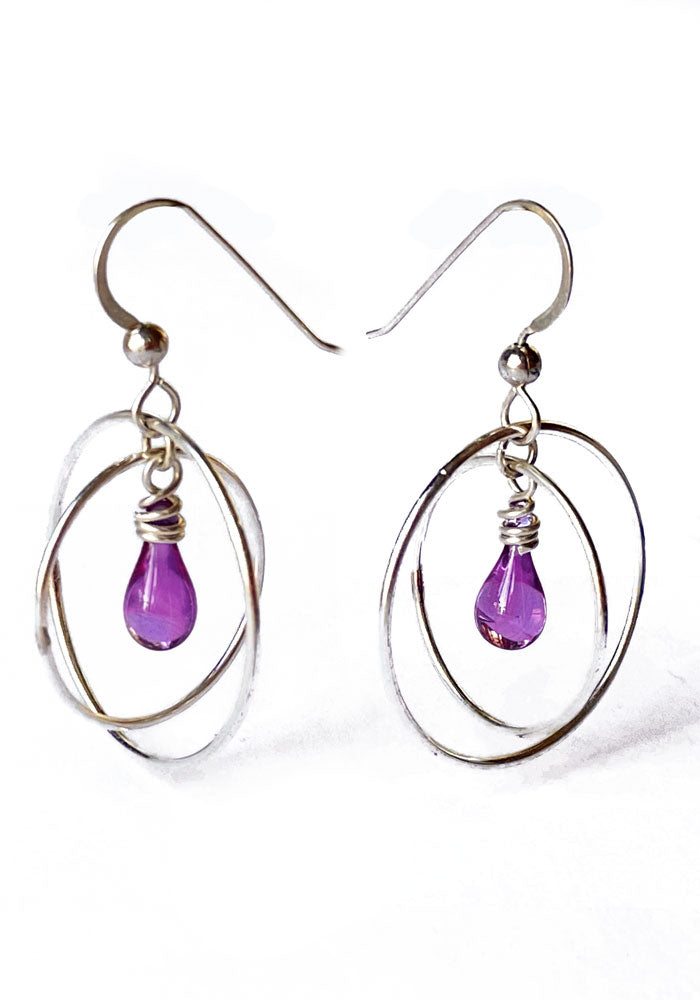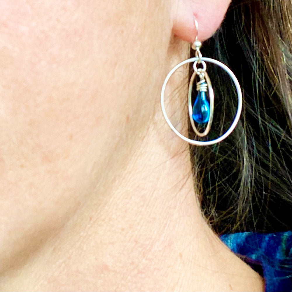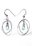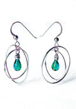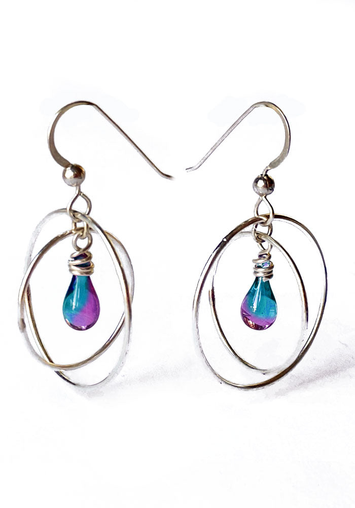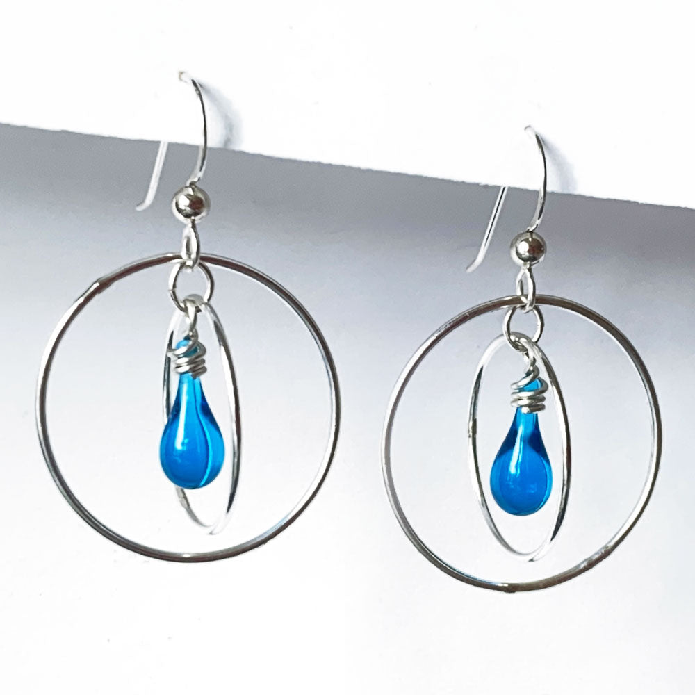 These free swinging gyroscope earrings with a dainty drop of glowing glass will carry you through any day - or night! Sized just right for daily wear, these earrings will become your new “go to” earrings.