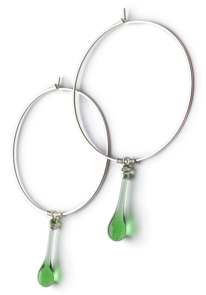 We use stained art glass or recycled bottle glass to make the droplets themselves. All wire and ear hooks are hypo-allergenic sterling silver, and the sterling silver wire is 100% recycled. Necklaces come on sterling silver chain.