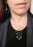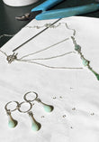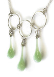 This sweet little necklace has people gushing! Three silver circles join together to bear dainty drips of sun-melted glass, made from a broken vintage jadeite plate. Perfect to dress up your daily wear or to add an extra little touch of elegance to a night out.