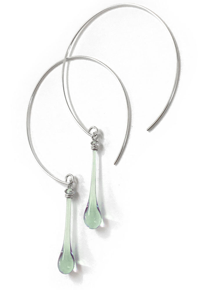 A single teardrop of sun-melted glass dangles from a delicate circle of silver. The curvature of these chic semi-circles continues right through your earlobe, completing the stylish arc.