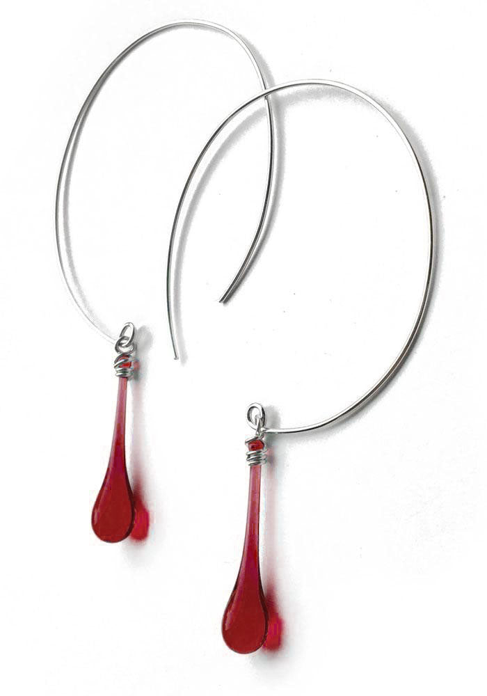 We use stained art glass or recycled bottle glass to make the droplets themselves. All wire and ear hooks are hypo-allergenic sterling silver, and the sterling silver wire is 100% recycled. Necklaces come on sterling silver chain.