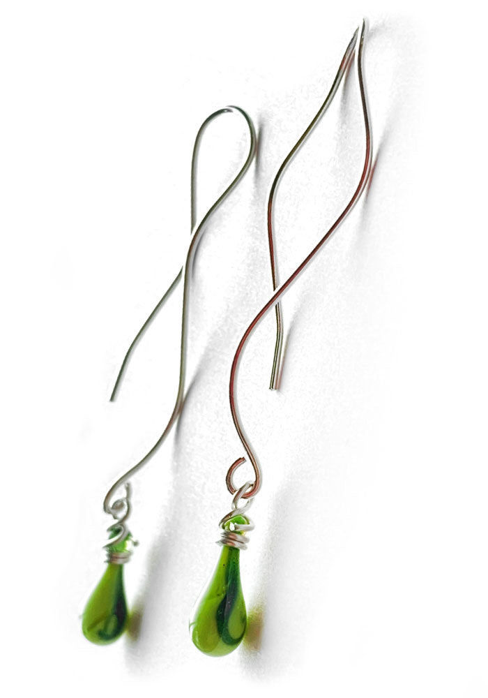 We use stained art glass or recycled bottle glass to make the droplets themselves. All wire and ear hooks are hypo-allergenic sterling silver, and the sterling silver wire is 100% recycled. Necklaces come on sterling silver chain.