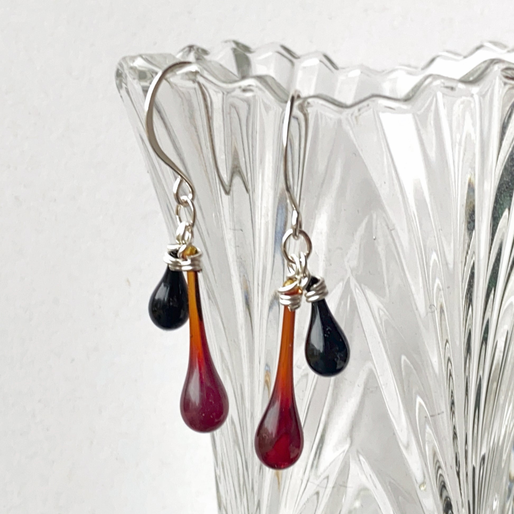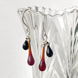Jewel-tone red glass teardrops paired with deep opaque black, with hand-forged ear hooks.