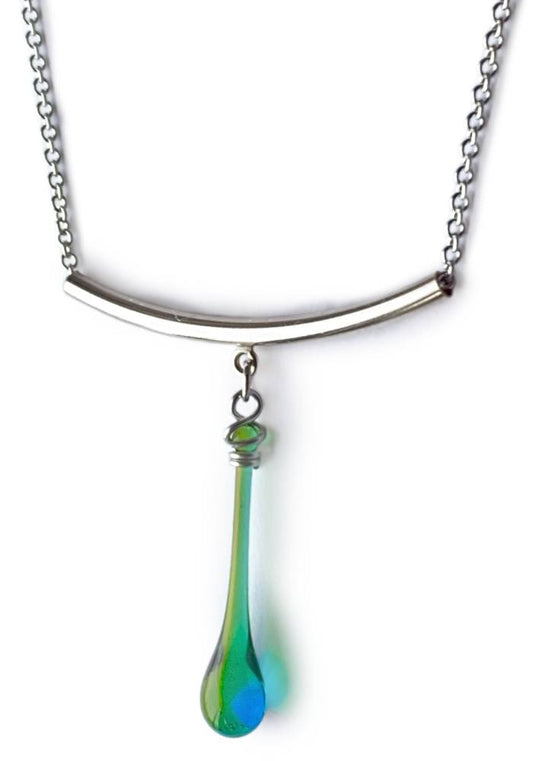 A single teardrop drips elegantly from a gentle curve of silver. Made from stained glass...