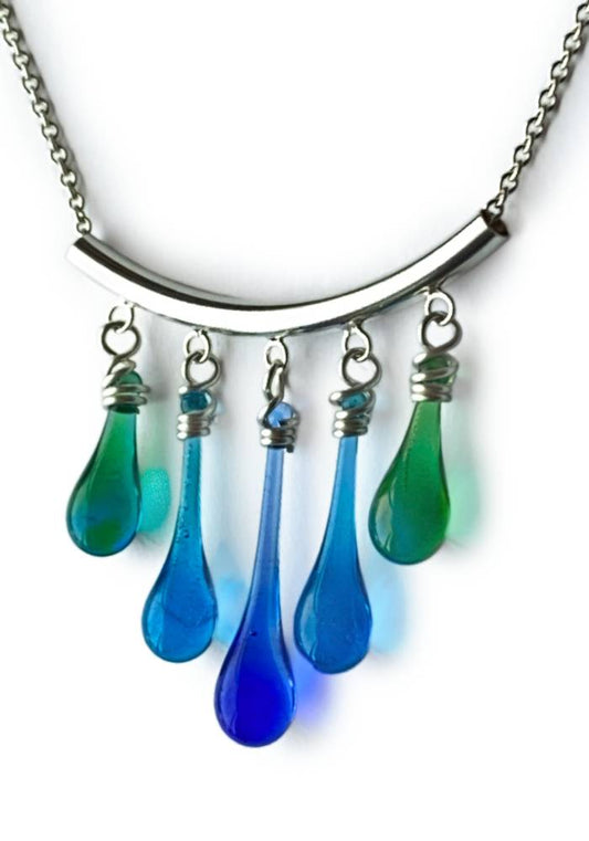 Five handmade glass droplets drip from a gently curving tube bead of sparkling silver in...