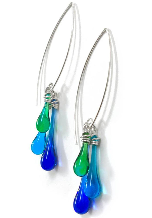 A trio of complementary colored glass teardrops hang from a silver "V" to form an...