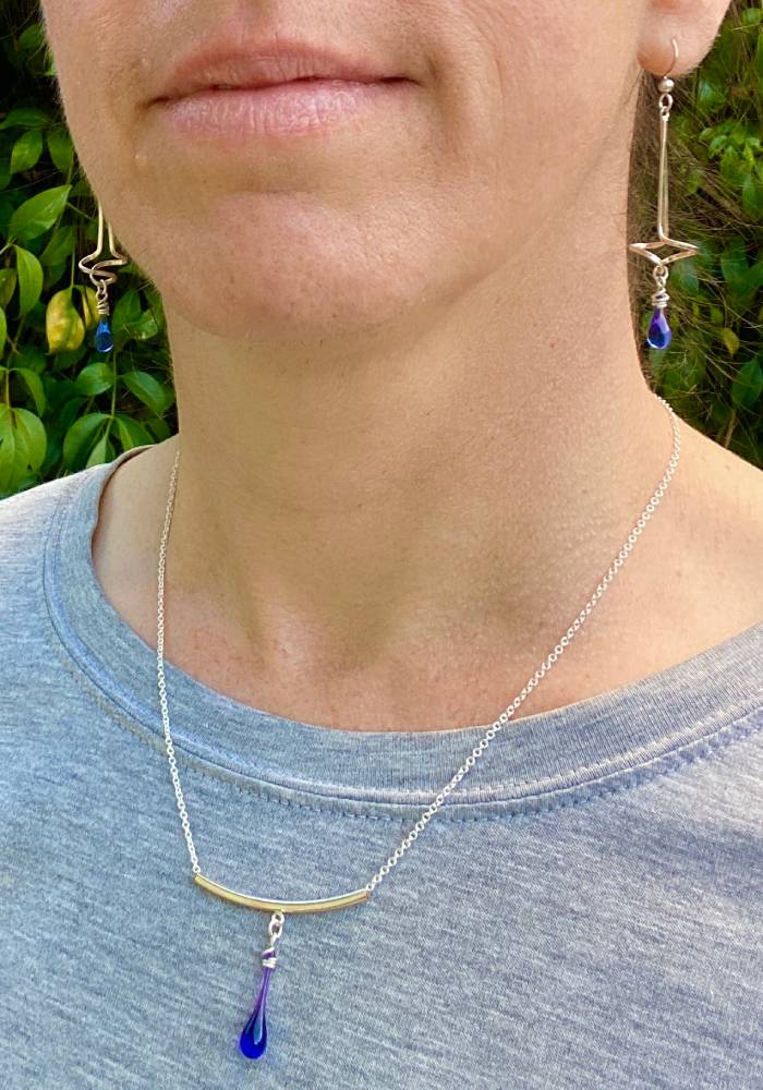 You are unique and original, and your jewelry should be too! Each drop of glass is handmade in the artist’s backyard studio in Berkeley, California. Using a giant magnifying glass to focus sunshine, recycled bottles and stained glass were melted into these translucent, flowing drops under the open sky! No pieces are exactly alike.