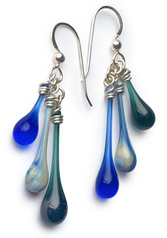 A charmingly mixed-up trio of swirling blue, cream, and teal teardrops of sun-melted glass. There...
