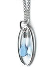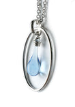 With a nod to the past, this modern take on the traditional cameo necklace makes a perfect pendant for everyday wear. Made from sun-melted glass, the transparent pale blue glass drop is framed in a smooth oval of recycled sterling silver.