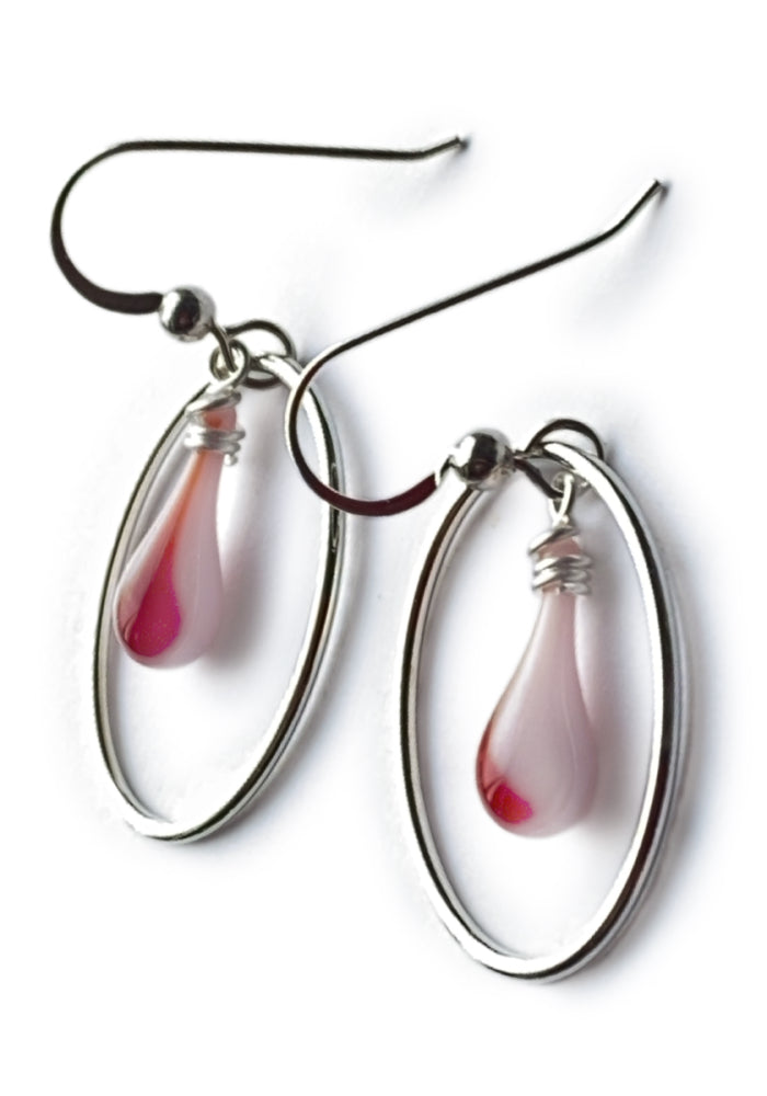 These opaque pink earrings have a dramatic red streak down the side of each glass teardrop. Framed in a silver oval, this is a modern take on the traditional cameo that you'll love!