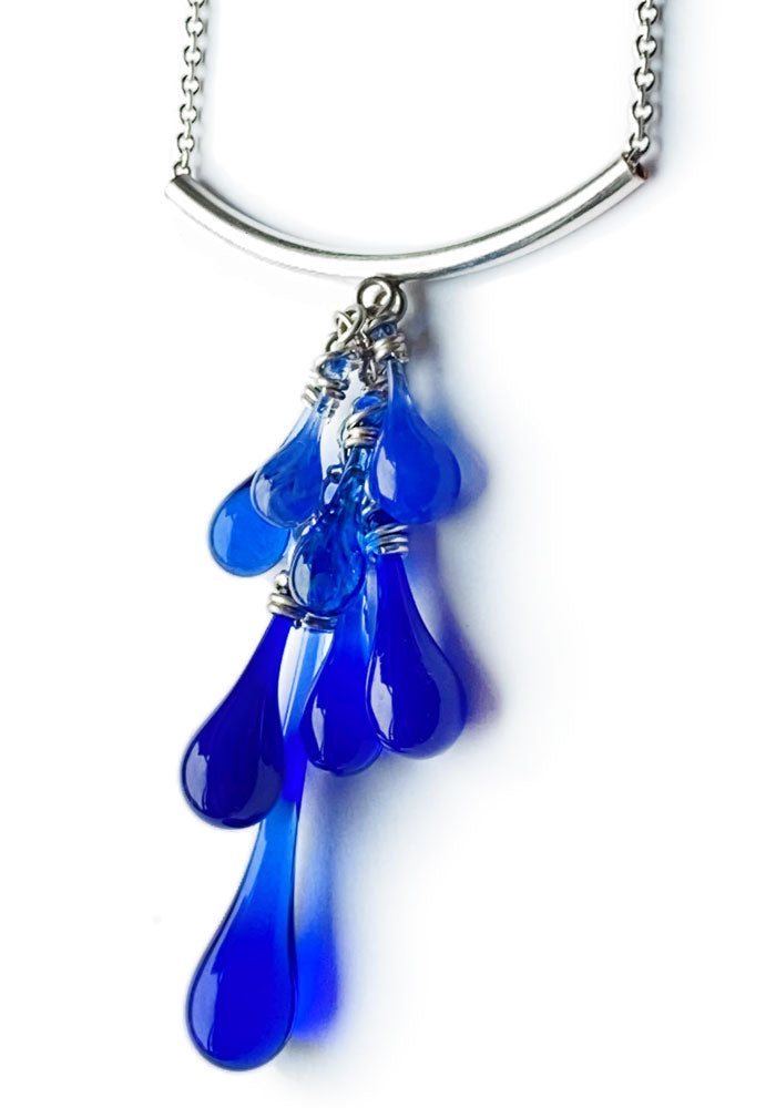 You are unique and original, and your jewelry should be too! Each drop of glass is handmade in the artist’s backyard studio in Berkeley, California. Using a giant magnifying glass to focus sunshine, recycled bottles and stained glass were melted into these translucent, flowing drops under the open sky! No pieces are exactly alike.