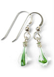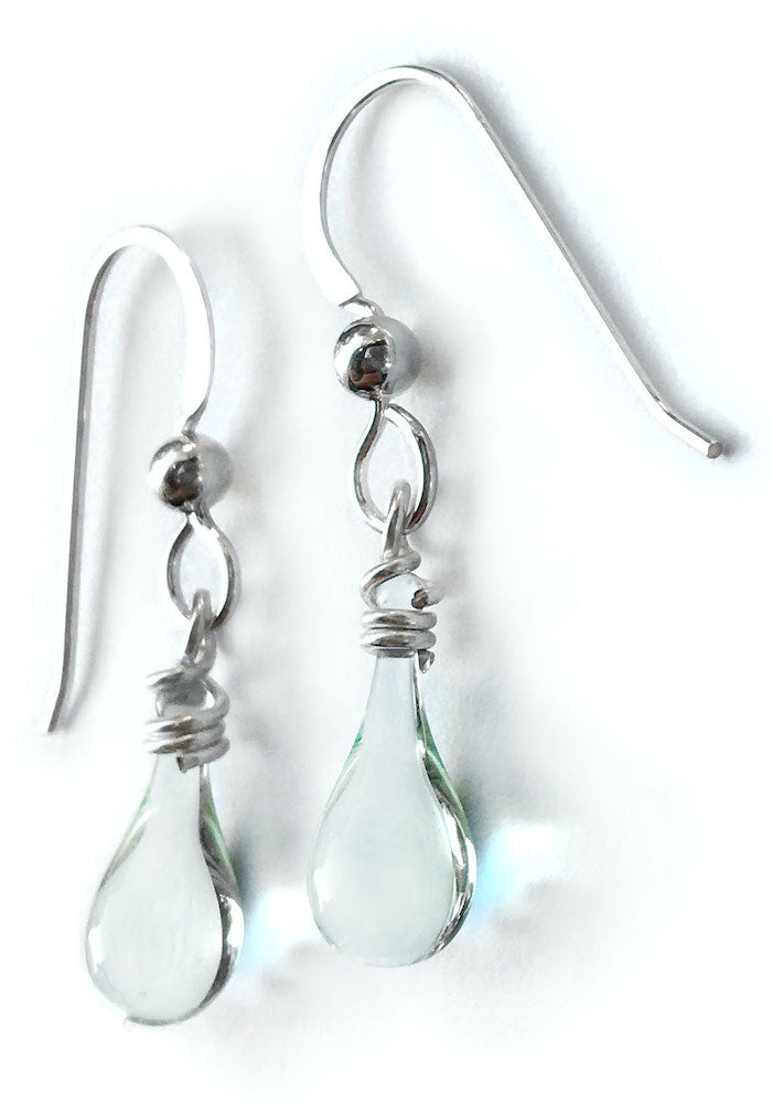 We use stained art glass or recycled bottle glass to make the droplets themselves. All wire and ear hooks are hypo-allergenic sterling silver, and the sterling silver wire is 100% recycled. Necklaces come on sterling silver chain.
