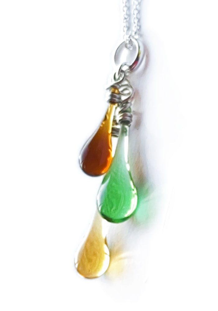 You are unique and original, and your jewelry should be too! Each drop of glass is handmade in the artist’s backyard studio in Berkeley, California. Using a giant magnifying glass to focus sunshine, recycled bottles and stained glass were melted into these translucent, flowing drops under the open sky! No pieces are exactly alike.