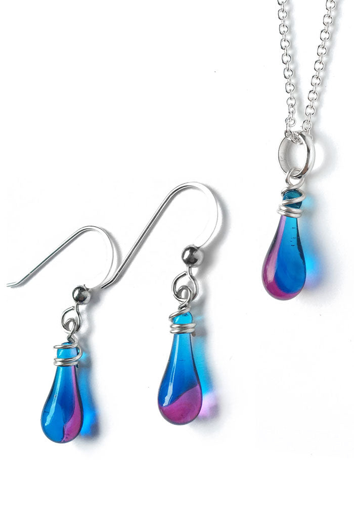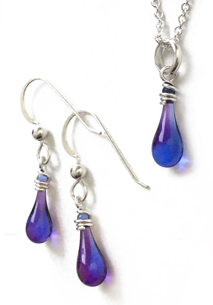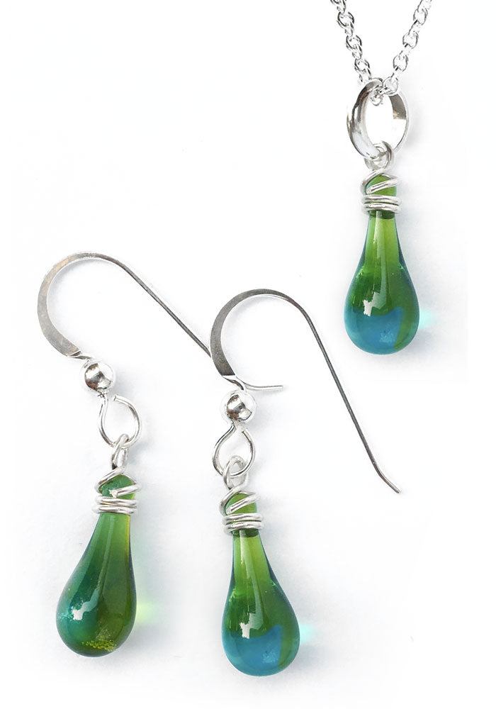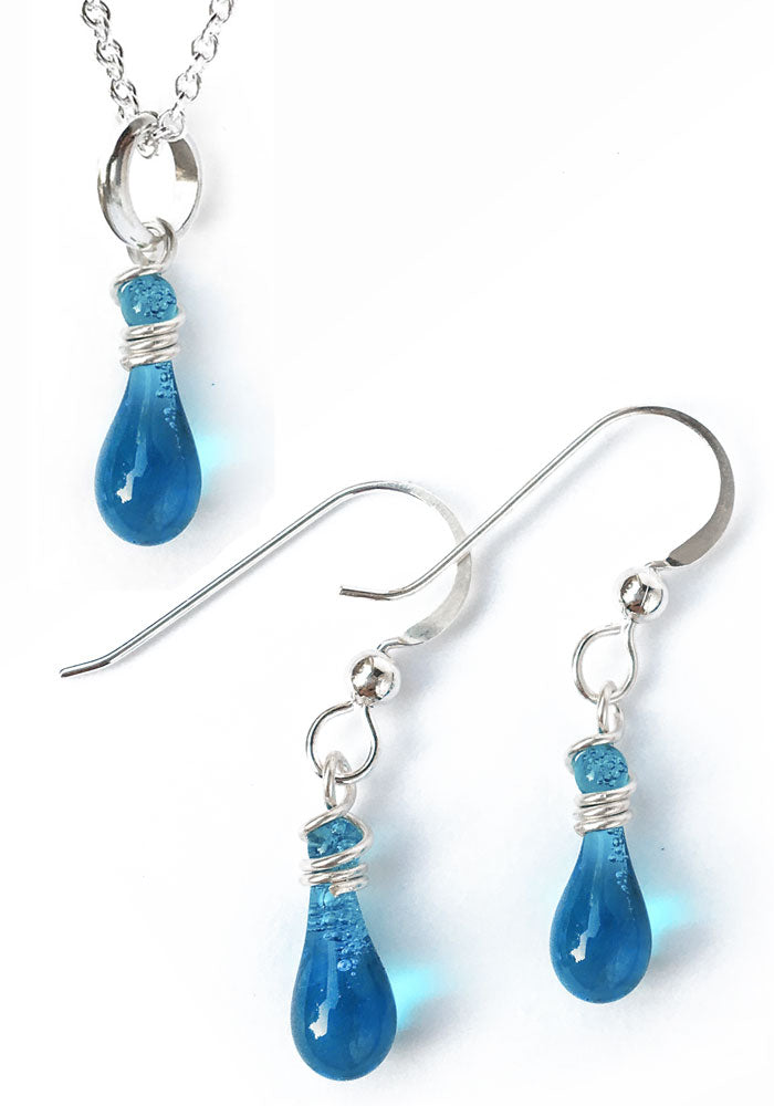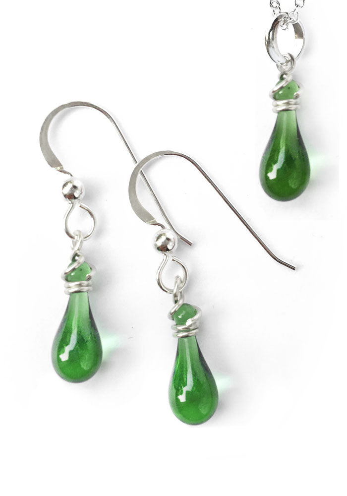 We use stained art glass or recycled bottle glass to make the droplets themselves. All wire and ear hooks are hypo-allergenic sterling silver, and the sterling silver wire is 100% recycled. Necklaces come on sterling silver chain.
