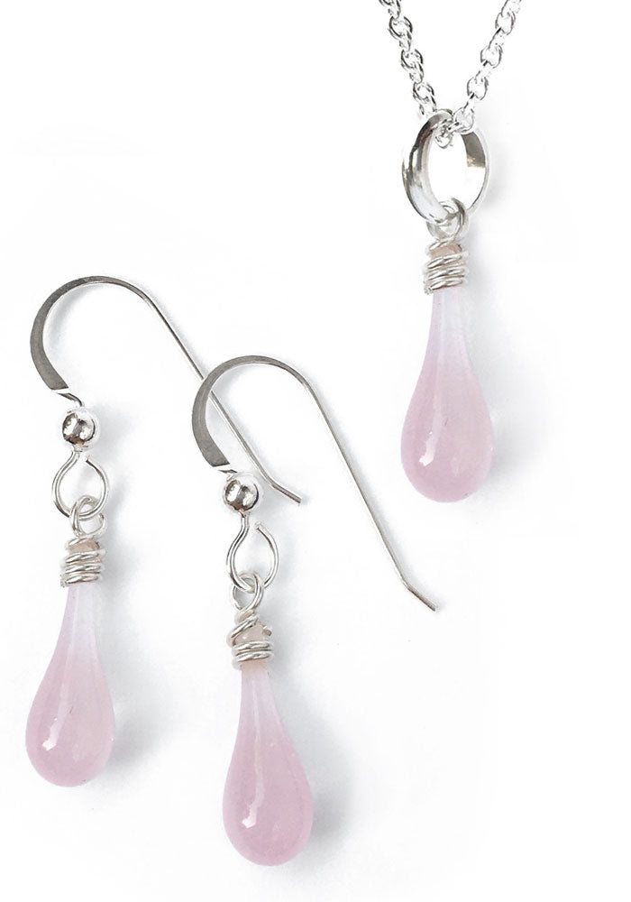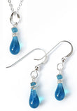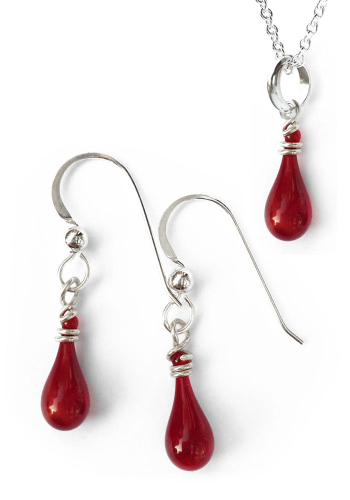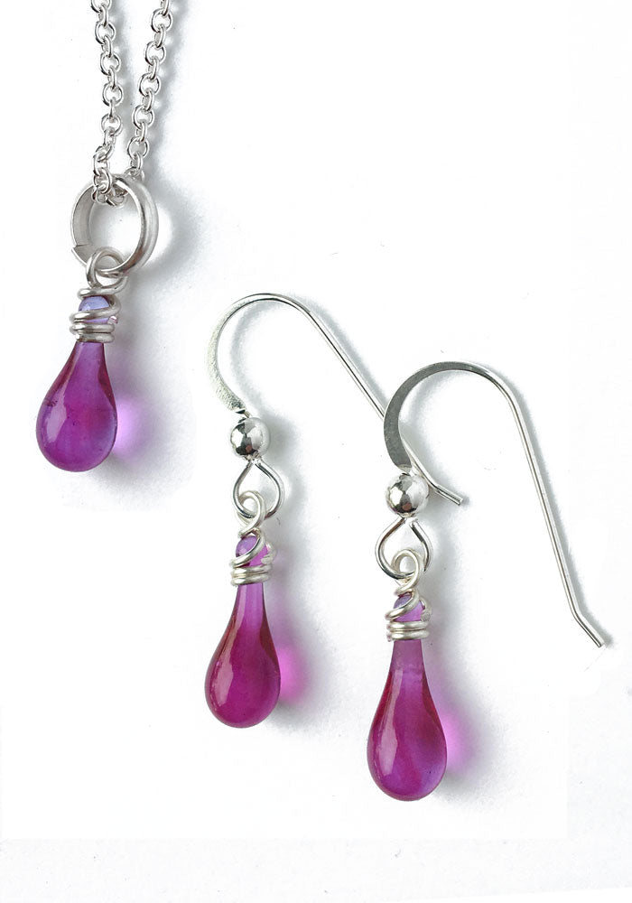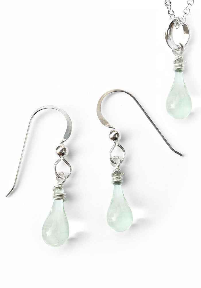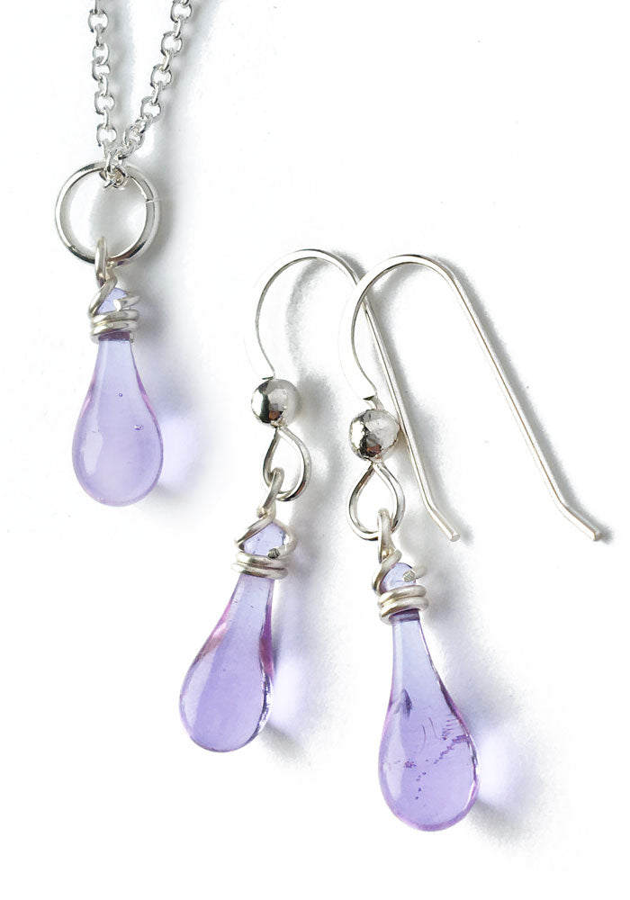 We use stained art glass or recycled bottle glass to make the droplets themselves. All wire and ear hooks are hypo-allergenic sterling silver, and the sterling silver wire is 100% recycled. Necklaces come on sterling silver chain.