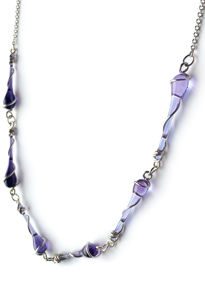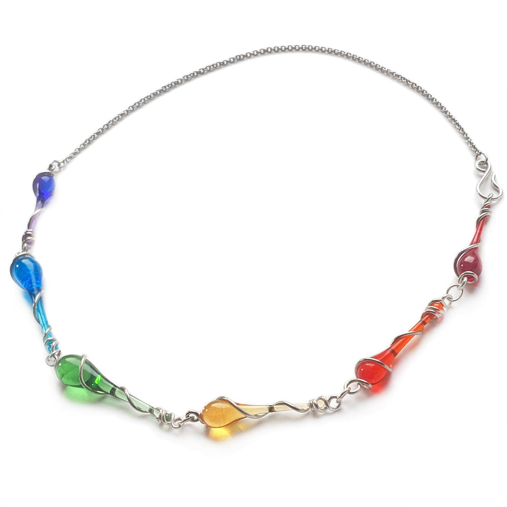 We use stained art glass or recycled bottle glass to make the droplets themselves. All wire and ear hooks are hypo-allergenic sterling silver, and the sterling silver wire is 100% recycled. Necklaces come on sterling silver chain.