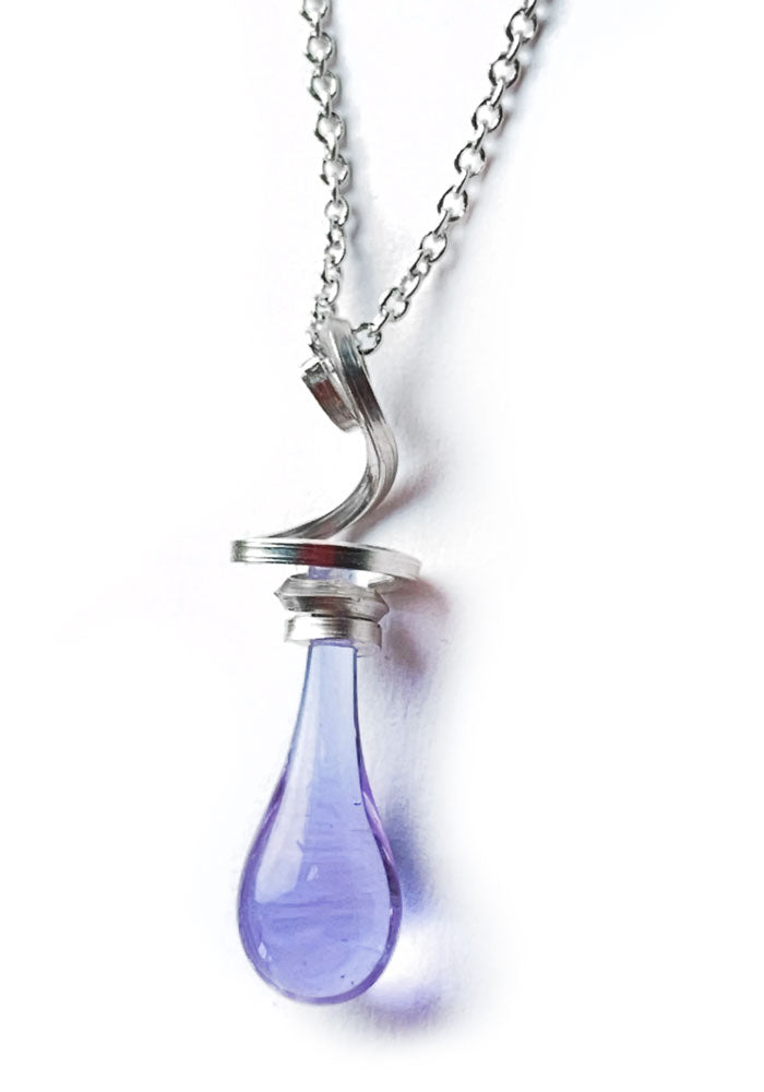 You are unique and original, and your jewelry should be too! Each drop of glass is handmade in the artist’s backyard studio in Berkeley, California. Using a giant magnifying glass to focus sunshine, recycled bottles and stained glass were melted into these translucent, flowing drops under the open sky! No pieces are exactly alike.