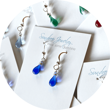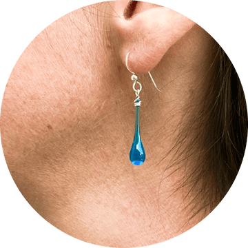 We use stained art glass or recycled bottle glass to make the droplets themselves. All wire and ear hooks are hypo-allergenic sterling silver, and the sterling silver wire is 100% recycled. Necklaces come on sterling silver chain.