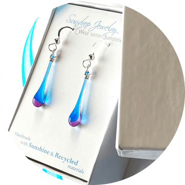 You are unique and original, and your jewelry should be too! Each drop of glass is handmade in the artist’s backyard studio in Berkeley, California. Using a giant magnifying glass to focus sunshine, recycled bottles and stained glass were melted into these translucent, flowing drops under the open sky! No pieces are exactly alike.